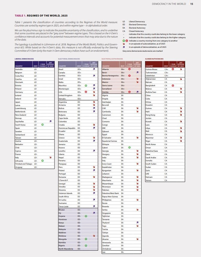 Raporti prestigjioz ka nxjerrë të dhëna alarmuese për botën, në fund të vitit 2025. Të dhënat kanë treguar se demokracia në botë është kthyer në nivelet e vitit 1979. Bota i ka 92 autokraci e 87 demokraci. 74 për qind e popullatës së botës (6 miliardë) tani jeton në autokraci.