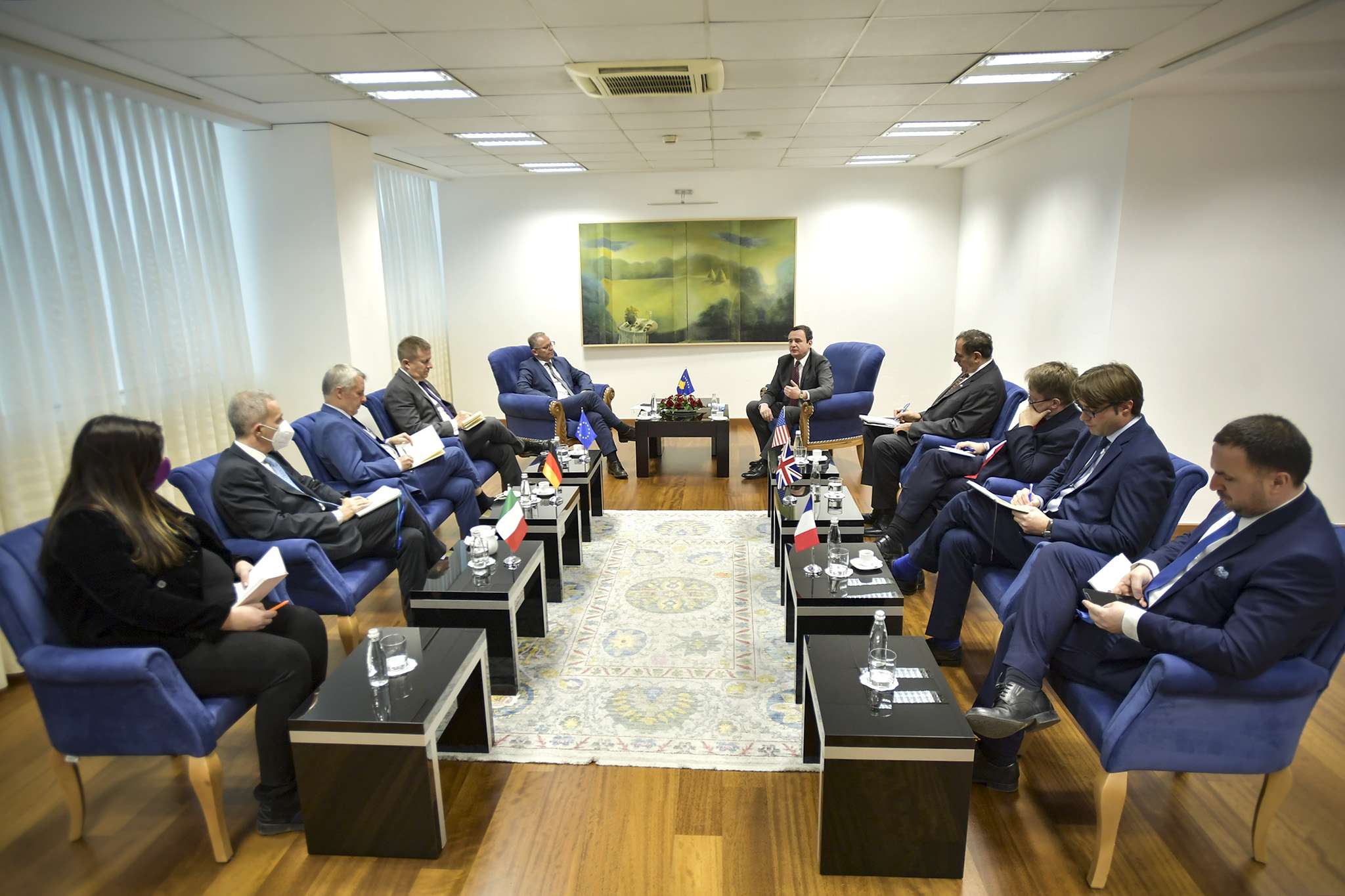 Në takim ishte i ngarkuari me punë në ambasadën e Shteteve të Bashkuara të Amerikës, Nicholas Giacobbe, ambasadori i Gjermanisë, Joern Rohde, ambasadori i Britanisë, Nicholas Abbott, zëvendësambasadori i Francës në Kosovë, Francois Cypien, ambasadori i Italisë në Kosovë, Antonello De Riu, dhe përfaqësuesi i posaçëm i shefit të Misionit të Bashkimit Evropian në Kosovë, Tomas Szunyog.