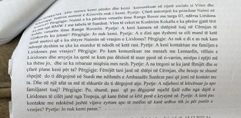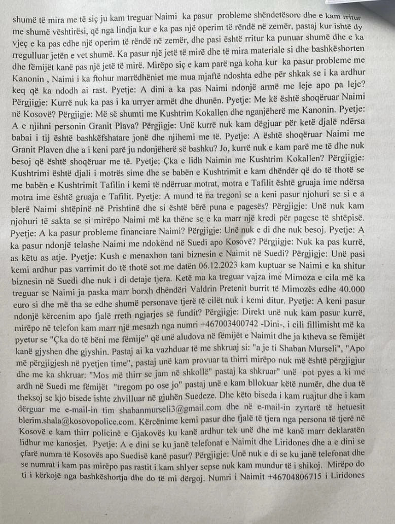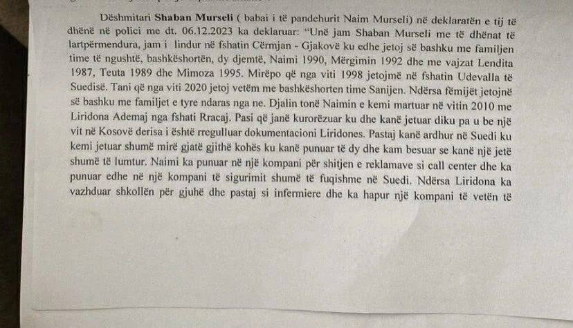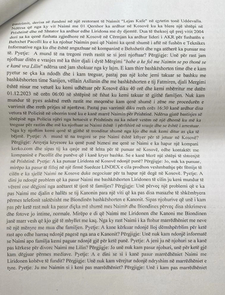 “Më ka thirr djali i dytë Mërgimi e më pyeti ‘babë a ke fol me Naimin se po thonë se e kanë vra Lilin’, ndërsa unë jam shokuar nga ky lajm. E kam thirr bashkëshorten time dhe e kam pyetur se çka ka ndodh dhe i kam treguar, pastaj pas një kohe jemi takuar së bashku me bashkëshorten Sanijen, vëllain Asllanin dhe me bashkëshorten e tij Fatmiren, djalin Mërgimin ditën më 1.12.2023 në veturë ku kemi udhëtuar për Kosovë diku 40 orë dhe kemi arritur më 3.12.203 në orët e mëngjesit te Naimi ku kemi biseduar shumë gjatë me gjithë familjen”, ka thënë në dëshminë Murseli.