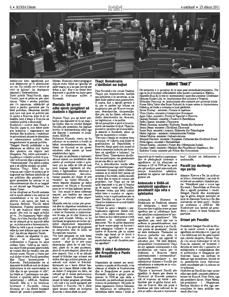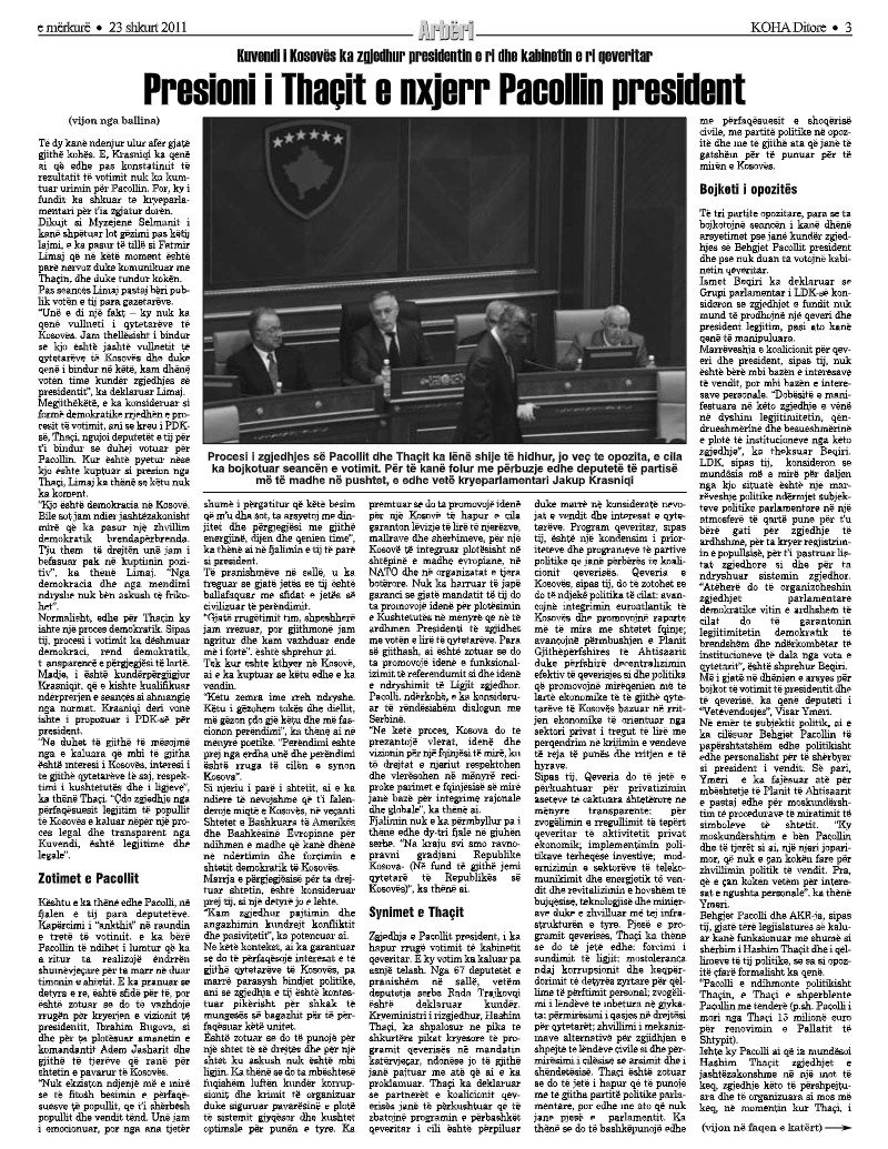 Atëkohë, Qeveria e pati në tavolinë zgjedhjen e presidentit të ri. Forcë e parë politike qe PDK-ja e Hashim Thaçit, ndërsa e dyta LDK-ja e Isa Mustafës. Koalicioni i tyre, i bërë dy vjet më parë, ia siguroi Thaçit postin e presidentit e Mustafës atë të kryeministrit. Por, zgjedhja e Thaçit u bë me disa vështirësi. Mustafa nuk i kontrollonte të gjithë deputetët e partisë së tij që ta votonin rivalin politik të të dy periudhave, asaj të para dhe pas luftës. Në seancën për zgjedhjen e tij, në mes të raundeve pati pauza, takime e negociata të Thaçit e Mustafës me deputetë. Disa syresh demonstruan liri në ushtrimin e mandatit, e të tjerë nënshtrim ndaj qëndrimit të partisë.