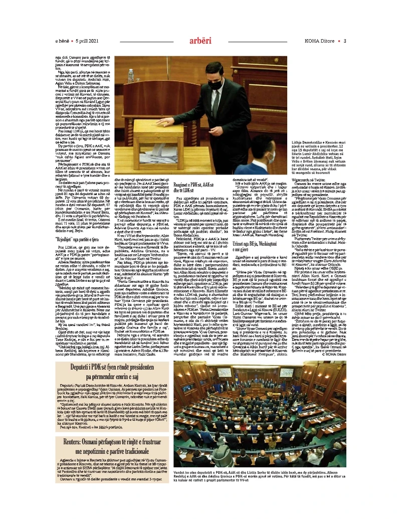 Për t’i shmangur ngërçin institucional dhe zgjedhjet e reja, me ndërmjetësim të ambasadorit amerikan në Prishtinë, Christopher Dell, për një javë, deputetëve u shkoi në zarf një propozim për presidentin e ri.