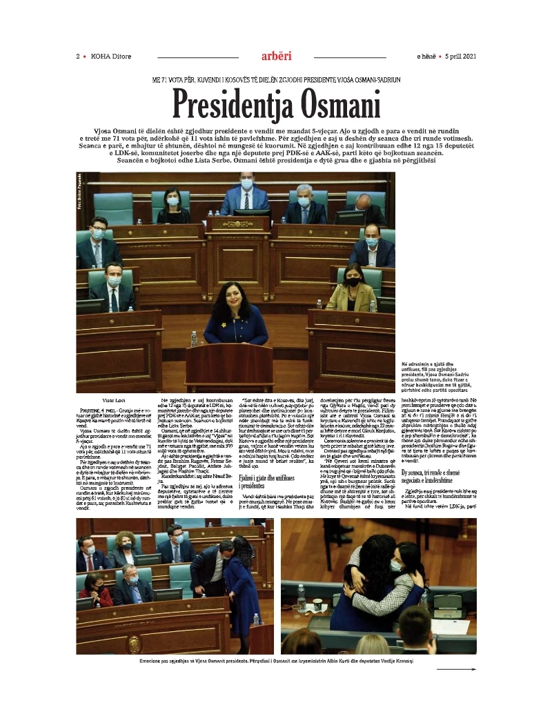 Vjosa Osmani u zgjodh pas Thaçit, por paraprakisht u desh të jetë pjesë e fushatës intensive në terren me LVV-në, besimin e së cilës e kërkoi për postin. LVV-ja e fitoi shumicën parlamentare e LDK-ja ia siguroi pjesën tjetër të votave dhe ajo u zgjodh presidente më 4 prill 2021.