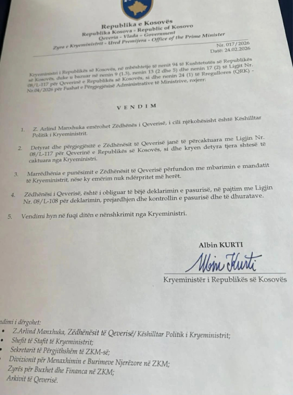 Letër lexuesit — pse po kërkojmë mbështetjen tuaj Kontribuo“Kryeministri i Republikës së Kosovës, në mbështetje të nenit 94 të Kushtetutës së Republikës së Kosovës, duke u bazuar në nenin 9 (1.3), nenin 13 (2 dhe 5) dhe nenin 17 (2) të Ligjit Nr. 08/L-117 për Qeverinë e Republikës së Kosovës, si dhe nenin 24 (1) të Rregullores (QRK) Nr.04/2026 për Fushat e Përgjegjësisë Administrative të Ministrive, nxjerr: Z. Arlind Manxhuka emërohet Zëdhënës i Qeverisë, i cili njëkohësisht është Këshilltar Politik i Kryeministrit”, thuhet në vendim.
