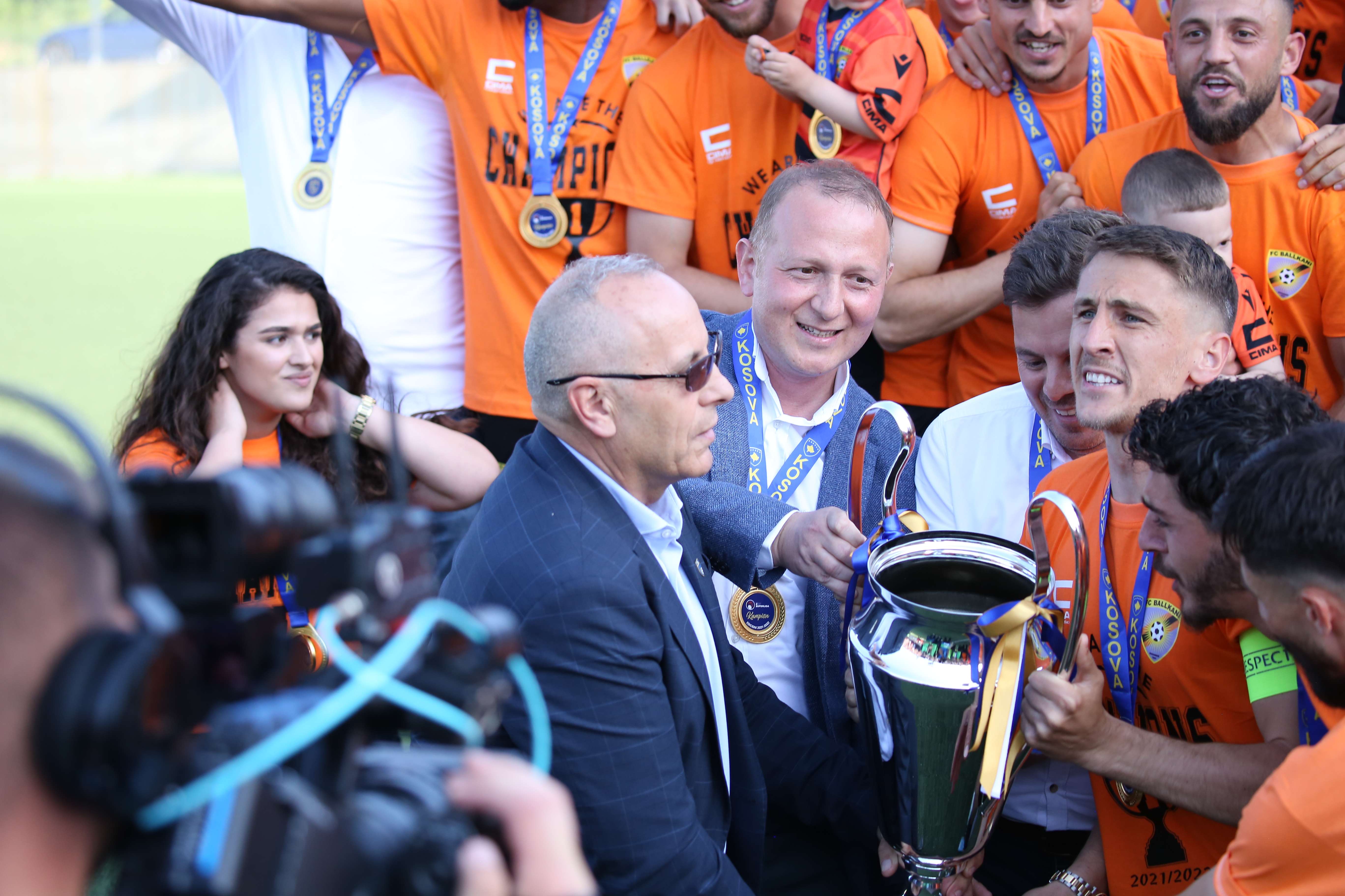 Trofeun e fitores, FK Ballkanit ia ndau z. Suat Bakkal, Drejtor Gjeneral i BKT Kosova së bashku me kryetarin e Federatës së Futbollit z. Agim Ademi dhe Kryetarin e Komunës së Therandës z.Bali Muharremaj.