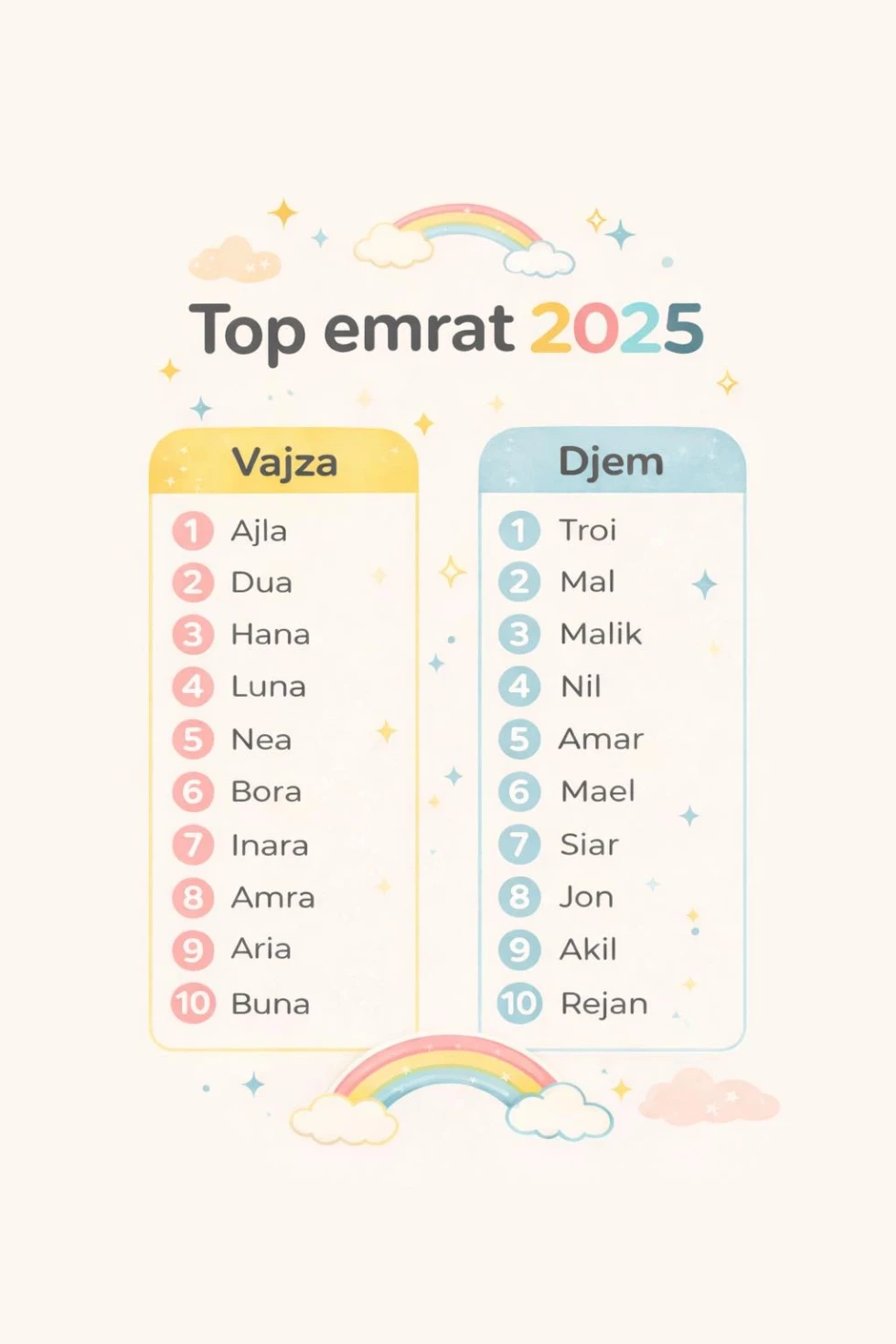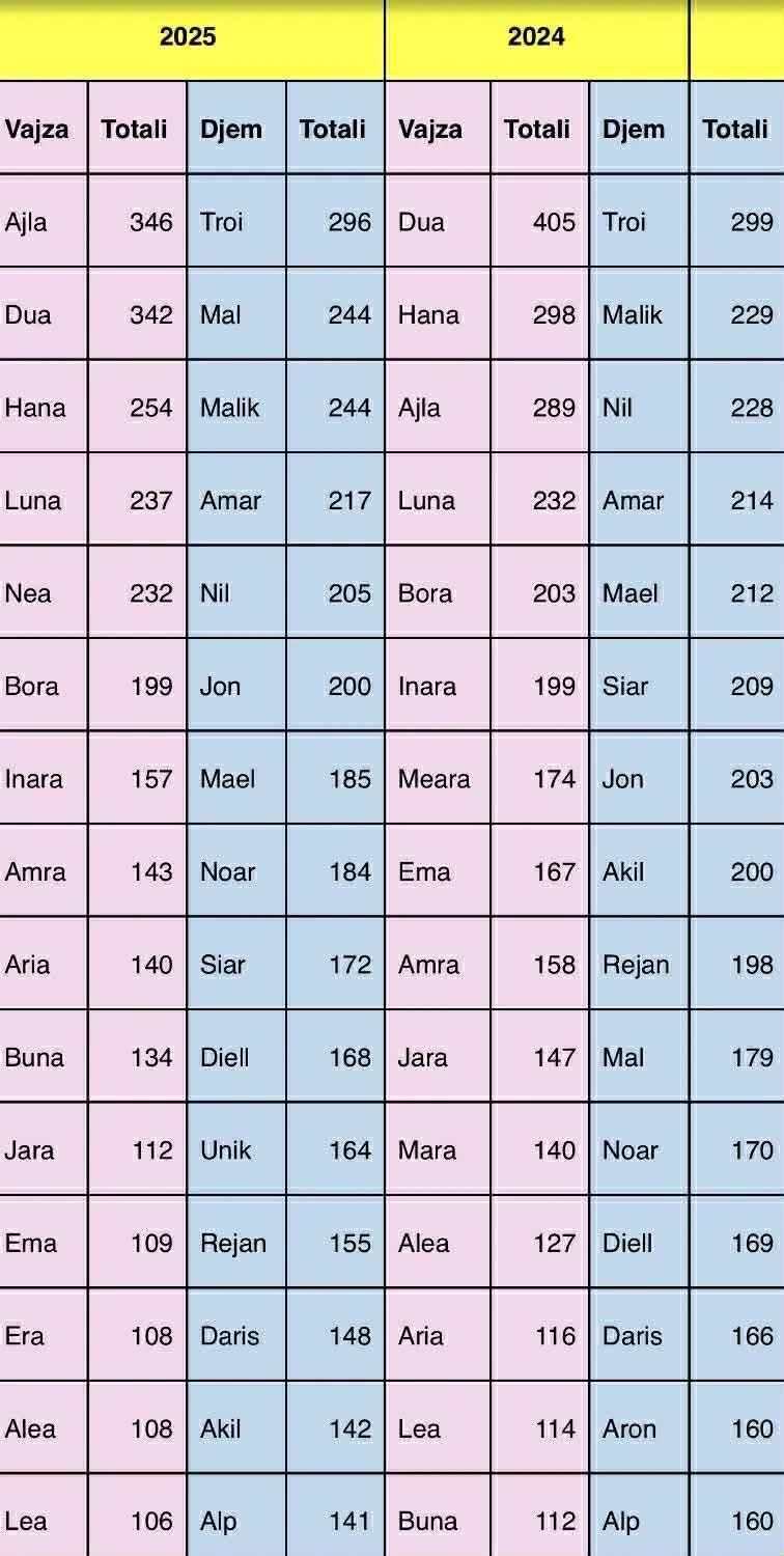 Për vitin 2025, Ministria e Punëve të Brendshme në një listë, ka treguar emrat më të shpeshtë të fëmijëve të lindur në Kosovë, të cilët kanë dominuar në regjistrimin e lindjeve.