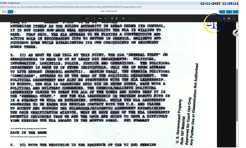 Diplomati amerikan, dëshmitari Christopher Hill, është pyetur në Dhomat e Specializuara lidhur me një kabllogram ku thuhej se UÇK-ja përbëhej nga sektori Politik, i Informimit, i Logjistikës, i Policisë, Drejtësisë dhe ai i Operacioneve.