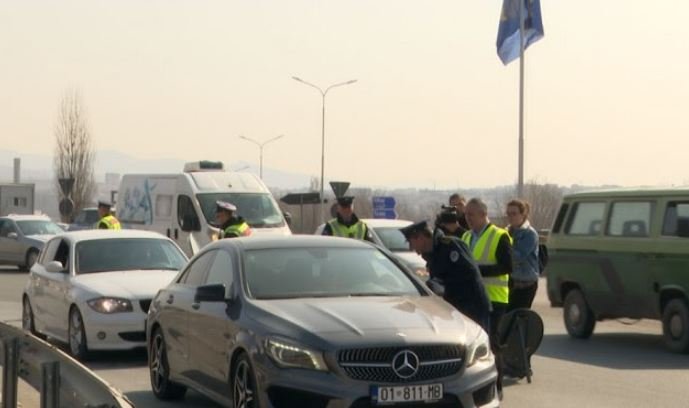 Pjesëtarë të Policisë së Kosovë kanë shpërndarë edhe fletushka për pjesëmarrësit në komunikacion tek rrethrrotullimi i magjistrales Prishtinë-Mitrovicë.