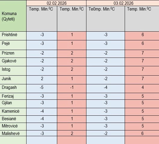 Temperaturat minimale pritet të sillen mes minus 4 dhe minus 2 gradë celsius, e maksimalet mes 4 dhe 7 gradë.