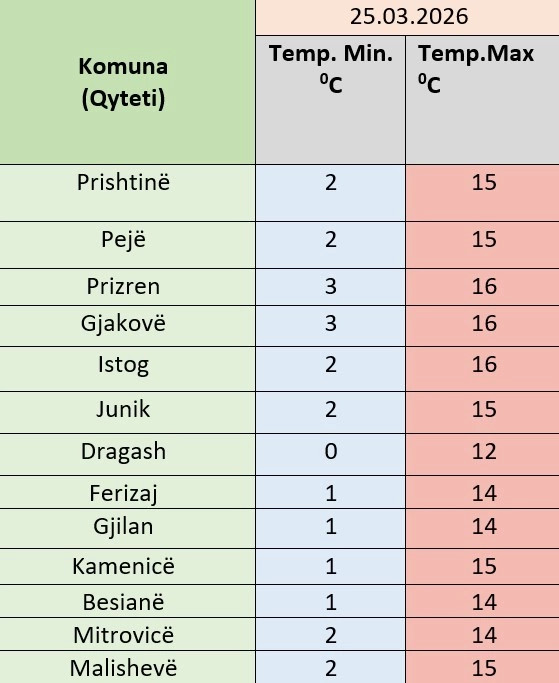 Instituti Hidrometeorologjik i Kosovës ka bërë të ditur se temperaturat minimale do të sillen mes 0 dhe 3 gradë celsius, e maksimalet mes 12-16 gradë.