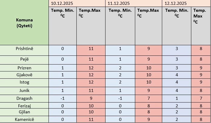 Instituti Hidrometeorologjik i Kosovës ka bërë të ditur se temperaturat minimale do të sillen mes 1-4 gradë celsius, e maksimalet mes 7-9 gradë.