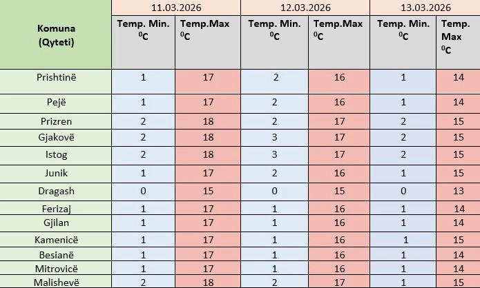Instituti Hidrometeorologjik i Kosovës ka bërë të ditur se temperaturat minimale do të sillen mes 0 dhe 2 gradë celsius e maksimalet mes 13-15 gradë.