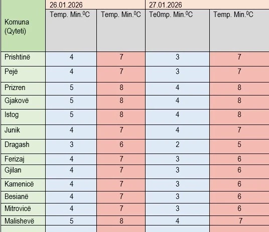Instituti Hidrometeorologjik i Kosovës ka bërë të ditur se temperaturat minimale do të sillen mes 2-4 gradë celsius, e maksimalet mes 5-8 gradë.