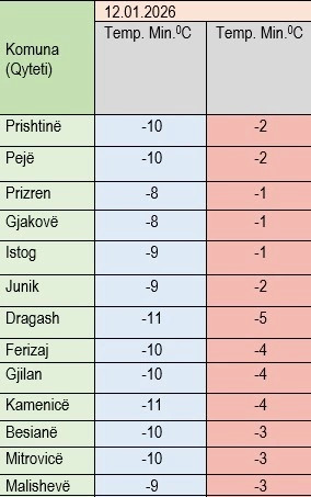 Instituti Hidrometeorologjik i Kosovës ka bërë të ditur se temperaturat minimale parashihen të sillen mes -11 dhe -8 gradë celsius, e maksimalet mes -5 dhe -1 gradë.