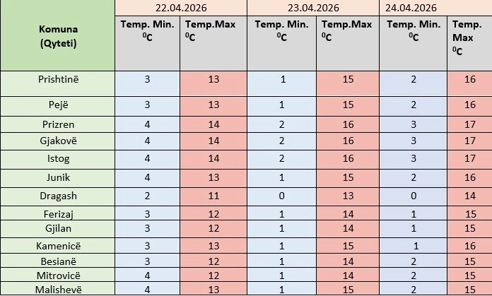 Instituti Hidrometeorologjik i Kosovës ka njoftuar se temperaturat minimale parashihen të sillen mes 0 dhe 3 gradë celsius, e maksimalet 14-17 gradë.