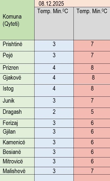 Temperaturat minimale parashihen të sillen mes 2-4 gradë celsius e maksimalet mes 5-8 gradë, ka njoftuar Instituti Hidrometeorologjik i Kosovës.