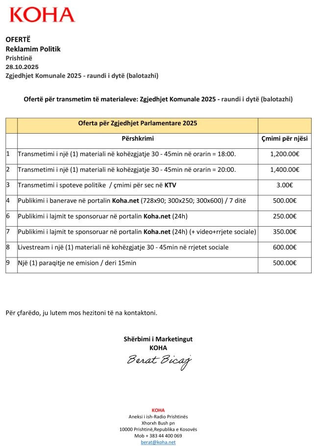 Ofertë për transmetim të materialeve në KOHA: Balotazhi i Zgjedhjeve Komunale 2025
