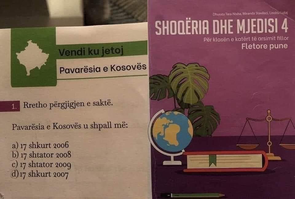 17 shkurt 2006, 17 shtator 2008, 17 shtator 2009 apo 17 shkurt 2007 janë opsionet që u ofrohen nxënësve në fletore-punën e lëndës “Shoqëria dhe Mjedisi 4” edhe pse data është dhënë e saktë në librin bazë.