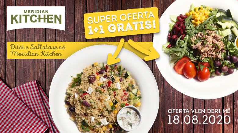 Duke filluar nga 06 deri më 18 Gusht, të gjitha këto sallata mund t’i shijoni përmes ofertës 1+1 brenda qytetit të Prishtinës. Ju mund të përfitoni dy sallata të ndryshme duke paguar vetëm për një sallatë ndërkaq tjetrën e merrni falas. Në Meridian Kitchen mund të gjeni llojllojshmëri sallatash si sallatë me pasta, sallatë me pulë, sallatat mediteriane, marokene dhe shumë lloje të tjera të shijshme.