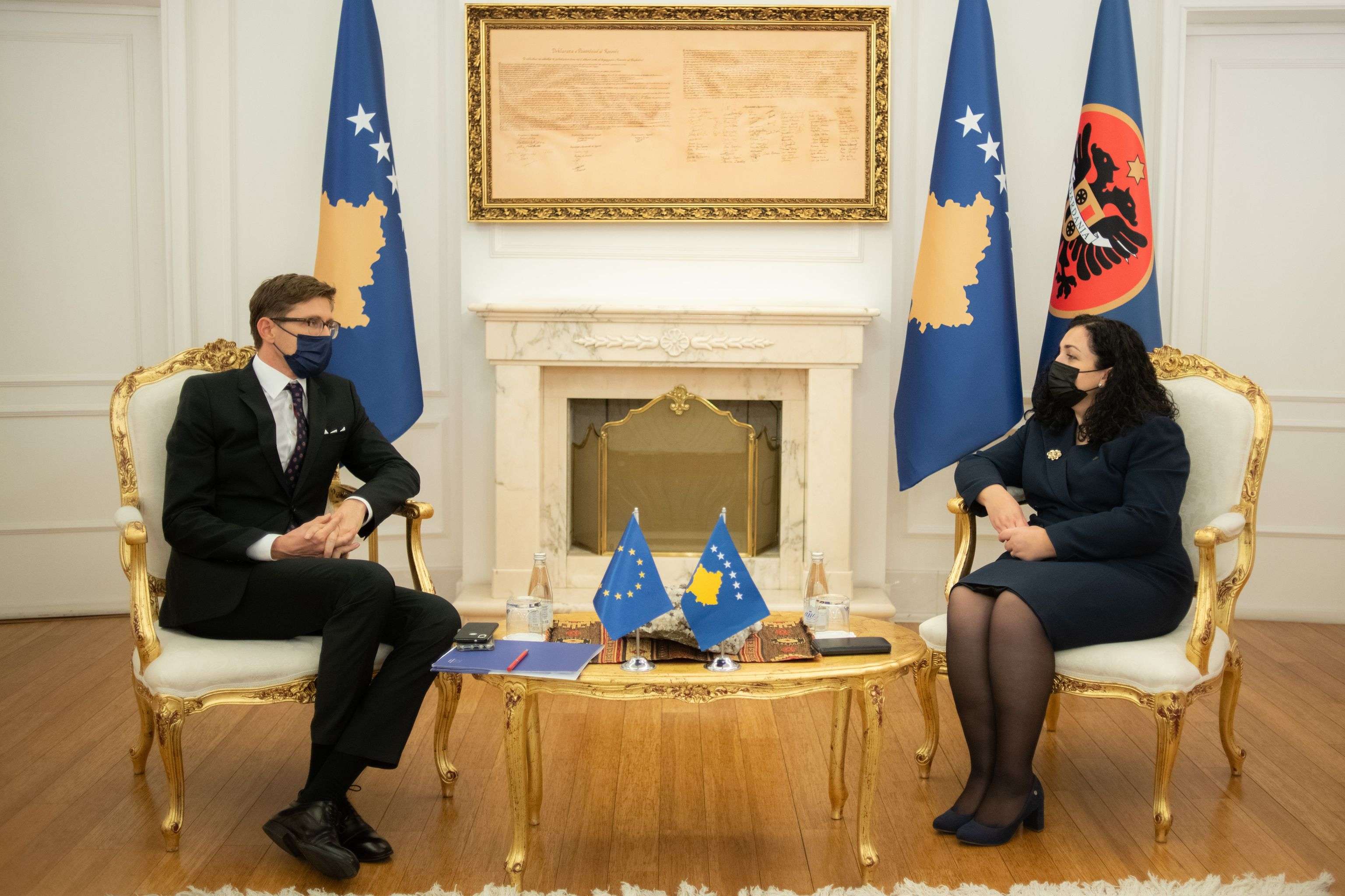 “Presidentja e Republikës së Kosovës, Vjosa Osmani Sadriu, ka pritur sot në takim drejtorin në Shërbimin Evropian të Veprimit të Jashtëm të BE-së, z. Marko Makovec. Në takim me z. Makovec, Presidentja Osmani ka theksuar se reformat e thella në sistemin e drejtësisë dhe sundimi i ligjit janë prioritete të Kosovës. Sundimi i ligjit, sipas Presidentes Osmani mbetet parakusht kryesor për suksesin e Republikës së Kosovës në çdo fushë përfshirë integrimin në BE. Në këtë kontekst, nga zyrtari i lartë i BE-së Makovec, Presidentja Osmani ka marrë mbështetjen për realizimin e procesit të vetingut në përputhje me standardet dhe praktikat evropiane”, thuhet në njoftim të Presidencës.