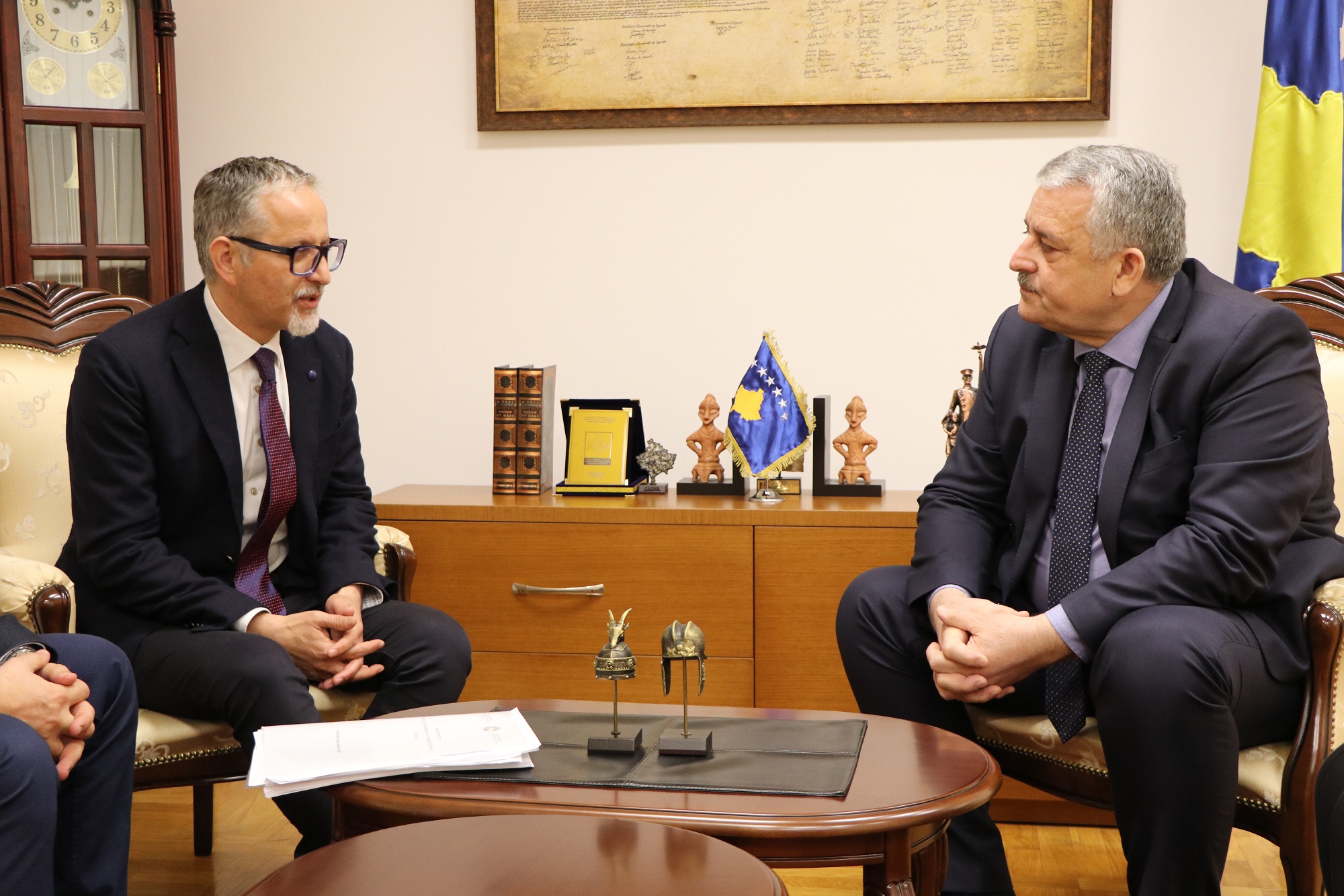 Ministri i Punëve të Brendshme dhe Administratës Publike, Agim Veliu, priti në takim ministrin e Shëndetësisë, Arben Vitia dhe drejtorin e Institutit Kombëtar të Shëndetësisë Publike, Naser Ramadanin, me të cilët diskutuan aktivitetet për menaxhimin e situatës lidhur me Koronavirusin.