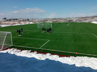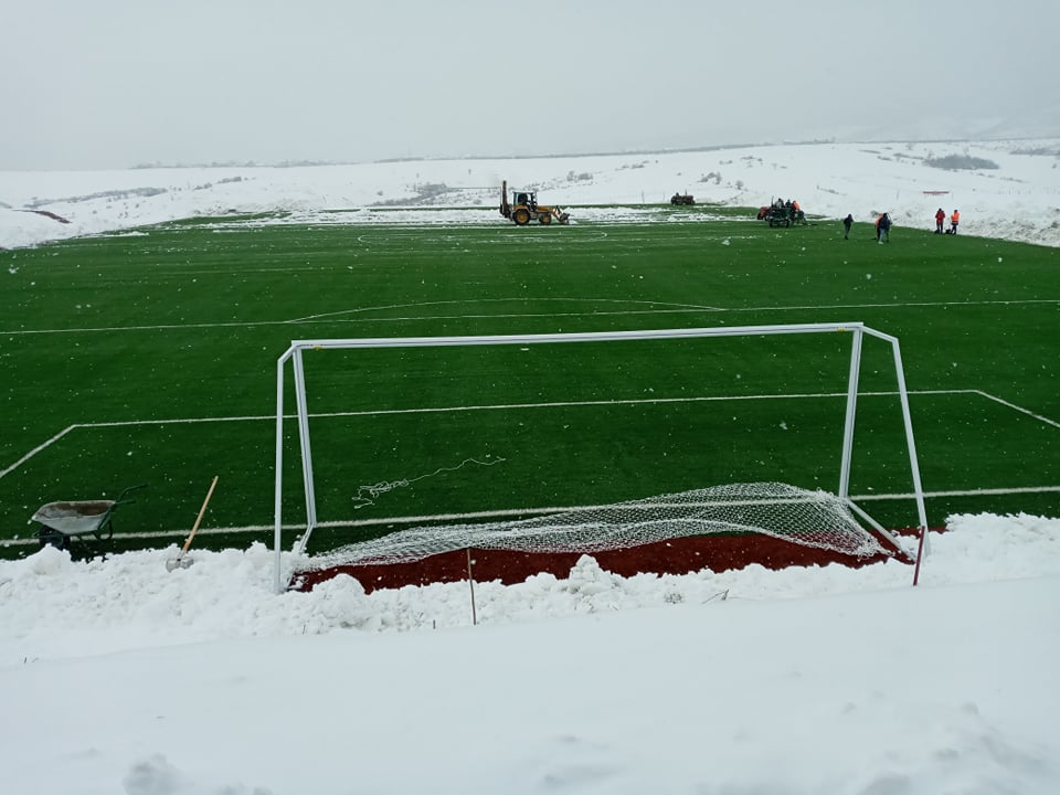 Dhjetëra punëtorë po e hiqnin borën nga fusha e Qendrës Nacionale të FFK-së në Hajvali për ta bërë gati për...