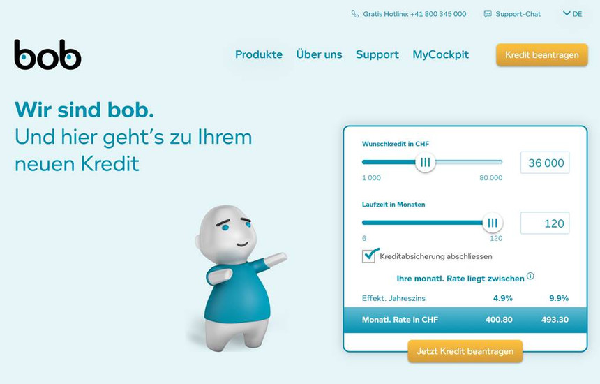 Po ashtu një nga institucionet financiare më të mirënjohura në Zvicër, me seli në Zurich, ka një platforme digjitale dhe inovative, ka hapur dyert e financimit që nga viti 2014. Platforma e aplikimit online e Bob.ch ka ndërtuar një imazh të fortë si bankë e besueshme, transparente dhe e shpejtë. Aplikimi juaj për kredi është I lehtë dhe I thjeshtë dhe mund të bëhet nga komfori i shtëpisë për më pak se 10 minuta.