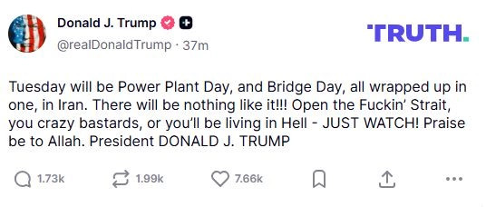 Kërcënimi i fundit: Në një postim me gjuhë ofenduese, Trumpi e përsëriti këtë kërcënim, duke përmendur të martën si ditën kur do të sulmoheshin caqet iraniane. Mirëpo disa orë pas kërcënimit të fundit, në një intervistë për Fox News, ai kishte deklaruar se një marrëveshje me Iranin është e mundur nga e hëna.