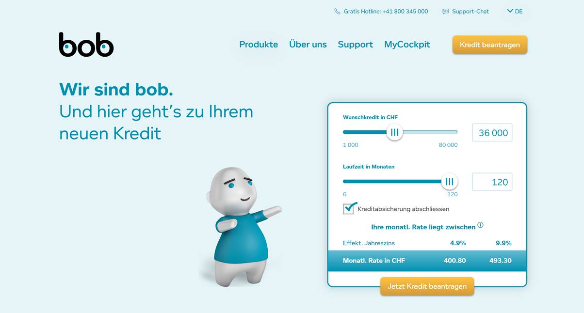 Po ashtu një nga institucionet financiare më të mirënjohura në Zvicër, me seli në Zurich, ka një platforme digjitale dhe inovative, ka hapur dyert e financimit që nga viti 2014. Platforma e aplikimit online e Bob.ch ka ndërtuar një imazh të fortë si bankë e besueshme, transparente dhe e shpejtë. Aplikimi juaj për kredi është I lehtë dhe I thjeshtë dhe mund të bëhet nga komfori i shtëpisë për më pak se 10 minuta.