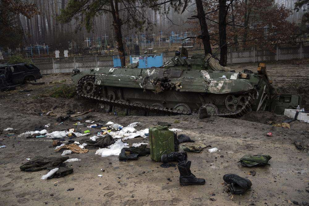 Në periferi të Kievit, shenjat e luftimeve të ashpra ishin kudo në vazhdën e rishpërndarjes ruse. Mjete të blinduara të shkatërruara nga të dyja ushtritë e mbetura në rrugë dhe fusha dhe pajisje ushtarake të shpërndara mbuluan tokën pranë një tanku të braktisur rus.