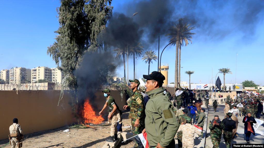Demonstruesit sulmuan ambasadën amerikane në Bagdad më 31 dhjetor 2019, për të dënuar sulmet ajrore të SHBA-së, dy ditë më parë, që vranë të paktën 25 anëtarë të një grupi militantësh të mbështetur nga Irani.