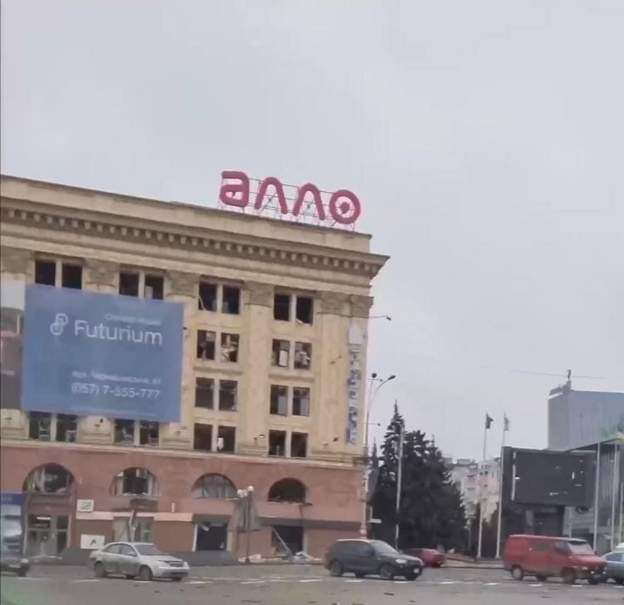 Anton Gerashchenko, këshilltar i Ministrit të Punëve të Brendshme të Ukrainës, ndau gjithashtu një video në llogarinë e tij zyrtare në Telegram të marrë nga niveli i rrugës në Sheshin Liria. Videoja tregon vendin e shpërthimit dhe mbeturinat në tokën ku dikur qëndronte ndërtesa e Administratës Shtetërore Rajonale të Kharkiv.