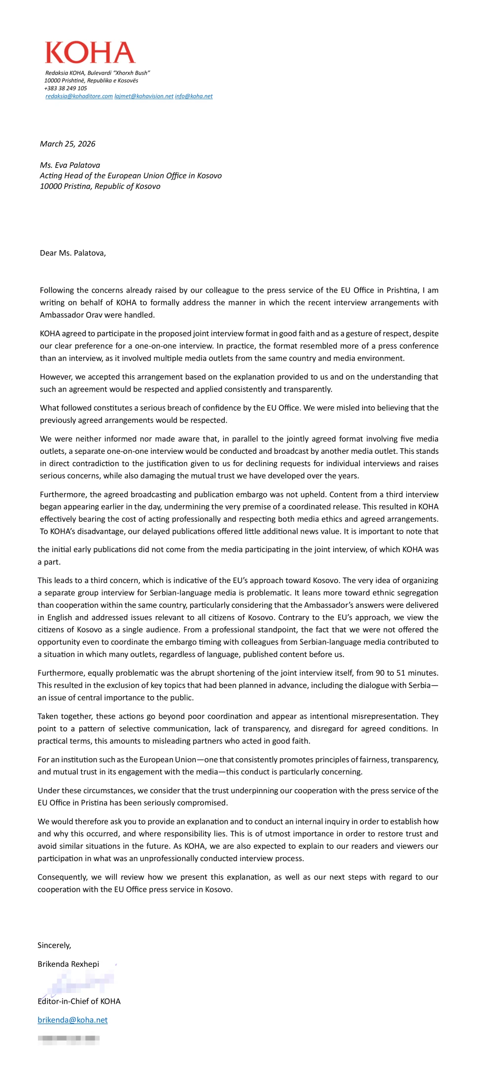 As në e-mailin e autorit të intervistës nga KOHA dhe as në atë të redaksisë, që kërkojnë sqarim të situatës, Zyra e BE-së dhe shërbimi i saj për media nuk janë përgjigjur. Për korrektësi më poshtë gjeni letrën që redaksia ia ka dërguar Zyrës së BE-së në Prishtinë.