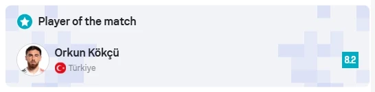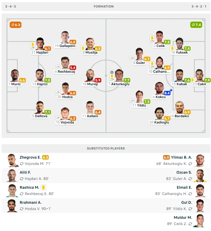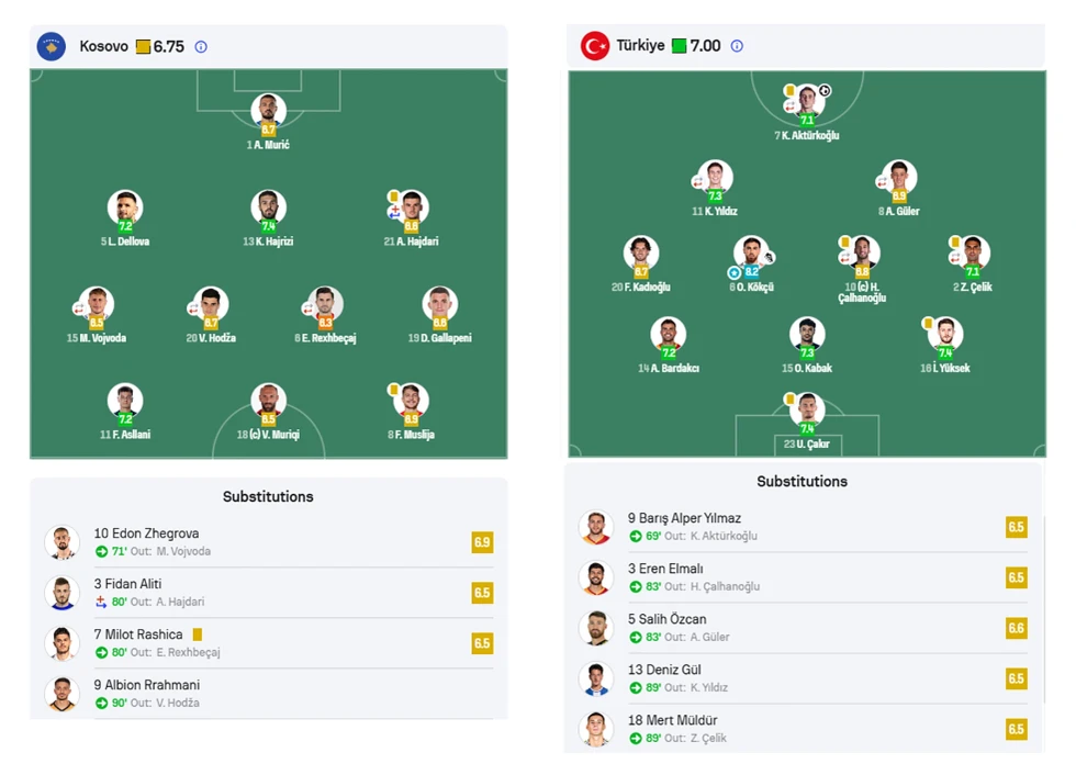 Prej zëvendësuesve, Edon Zhegrova u vlerësua me 6.9, kurse Fidan Aliti e Milot Rashica me 6.5. Orkun Kokçu i Turqisë mori notën më të lartë – 8.2.