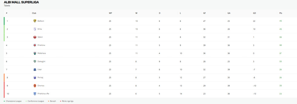 Ballkani ndërkohë është në moment të mirë. Pas fitores 3:0 ndaj Dritës, me të cilën u kthye në pozitën e parë, të mërkurën shënoi fitore të vështirë, por shumë të vlefshme, 1:0 ndaj Prishtinës së Re në udhëtim.
