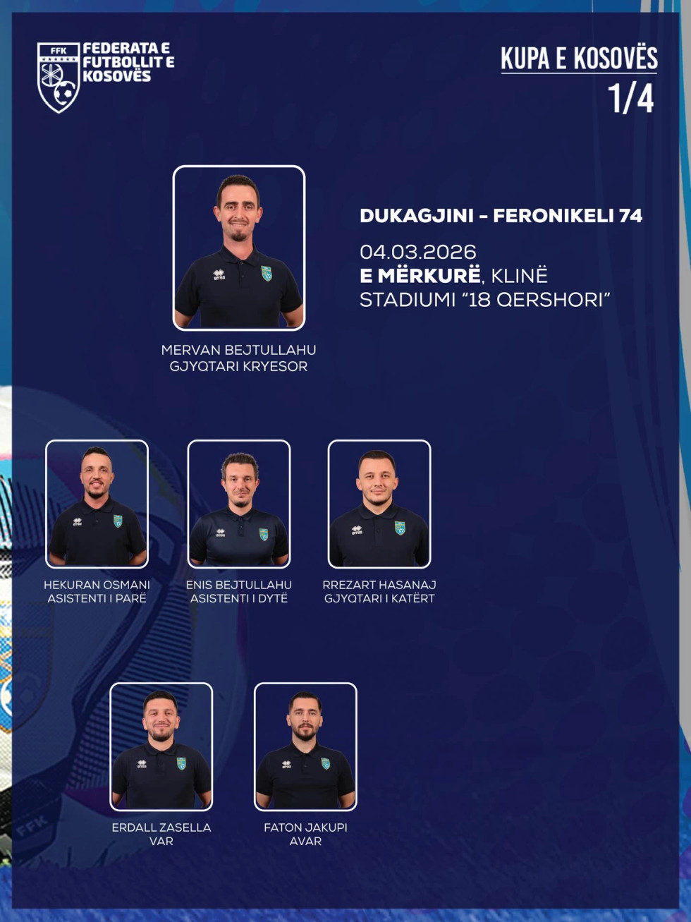 Mervan Bejtullahu do të jetë gjyqtar kryesor i ndeshjes Dukagjini – Feronikeli 74. Ndeshja luhet të mërkurën në Klinë dhe i takon çerekfinales së Kupës së Kosovës në futboll.