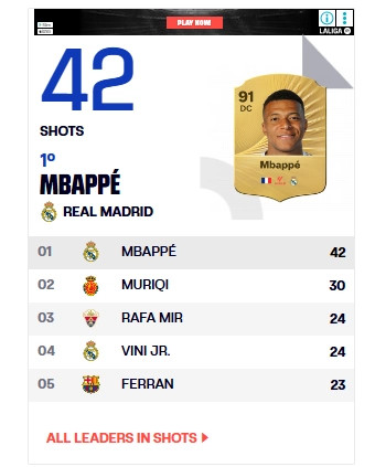 Pas Mbappes së Real Madridit, sulmuesi i Mallorcas renditet edhe për gjuajtje drejt portës.