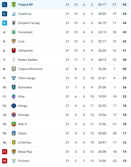 44 pikë në vendin e tretë i ka Dinamo, kurse Feronikeli 74 është i katërti me 43 pikë.