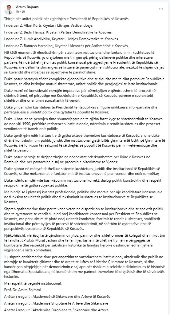 Ish-deputeti i PDK-së, ka shkruar se në këtë moment të rëndësishëm për stabilitetin institucional dhe funksionimin kushtetues të Republikës së Kosovës, kërkohet unitet politik konsensual për zgjedhjen e Presidentit me qëllim të shmangies së krizave të panevojshme institucionale, rrezikut të shpërndarjes së Kuvendit dhe mbajtjes së zgjedhjeve të parakohshme.