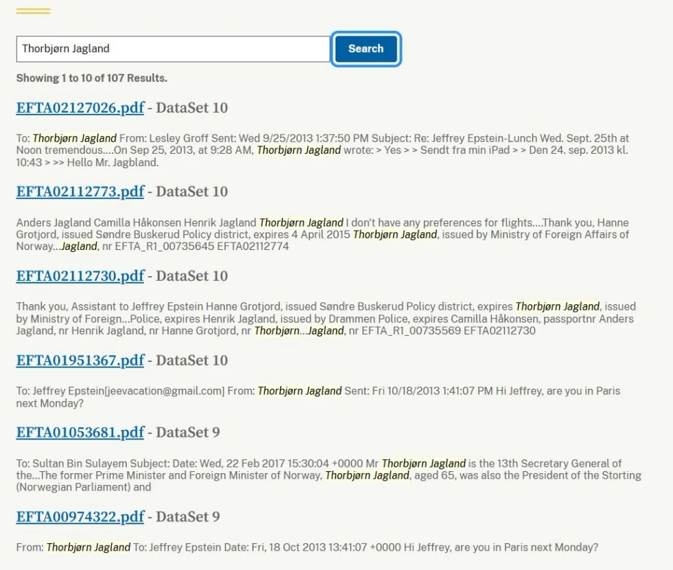 Në bazë të dokumenteve të publikuara nga Departamenti i Drejtësisë në SHBA, del se komunikimi i Thorbjørn Jaglandit me Epsteinin ishte i vazhdueshëm.