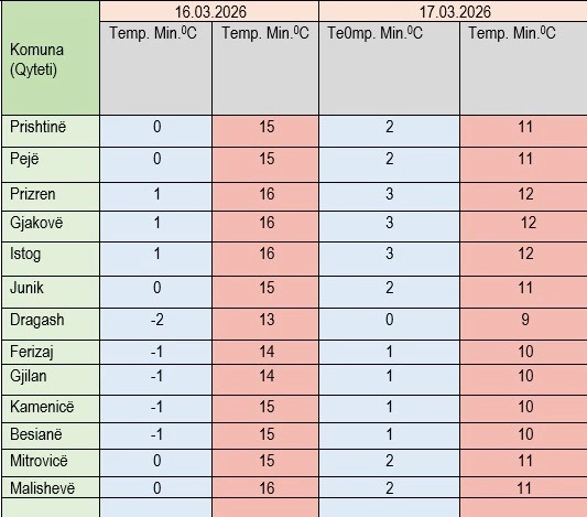 Instituti Hidrometeorologjik i Kosovës, ka njoftuar se temperaturat minimale do të lëvizin mes 0 dhe 3 gradë celsius, e maksimalet mes 9-12 gradë.