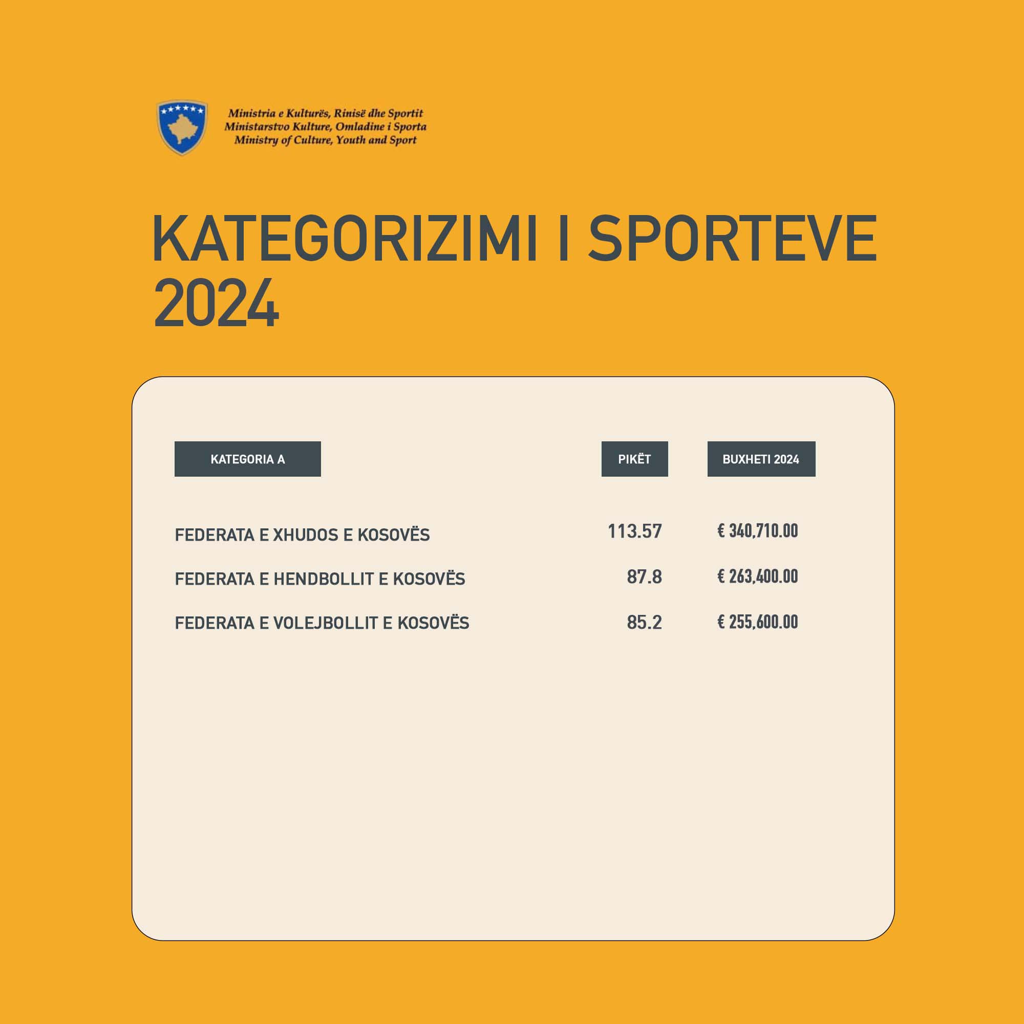 Ministri i Kulturës, Rinisë dhe Sportit, Hajrulla Çeku, ka caktuar të enjten vlerën financiare të koeficientit për kategorizimin e federatave...