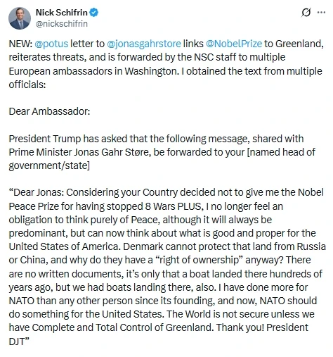 NEW: @potus letter to @jonasgahrstore links @NobelPrize to Greenland, reiterates threats, and is forwarded by the NSC staff to multiple European ambassadors in Washington. I obtained the text from multiple officials: