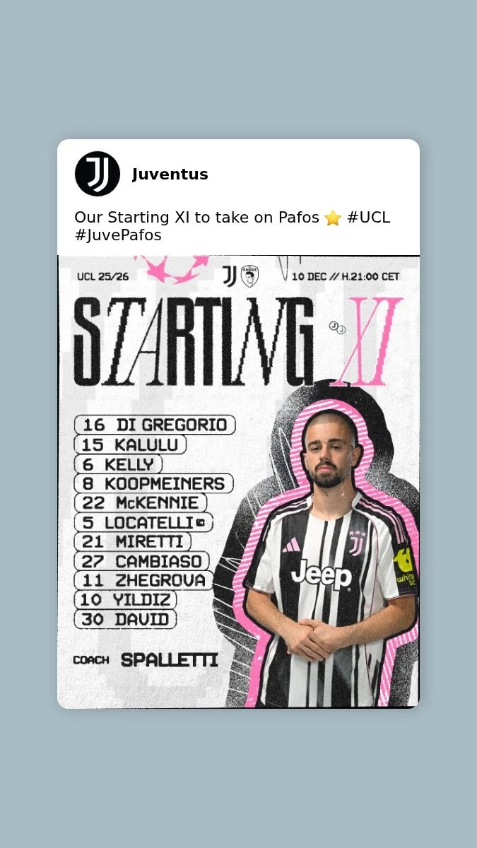 Di Gregorio, Locatelli, Kelly, Koopmeiners, Kenan Yildiz, Zhegrova, Kalulu, Miretti, McKennie, Cambiaso, David.
