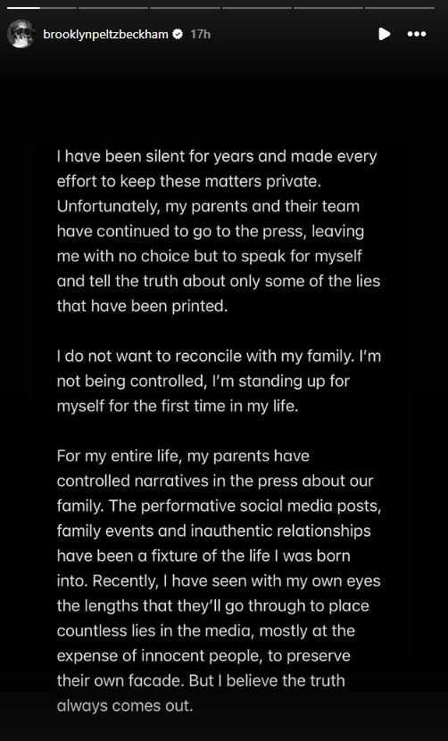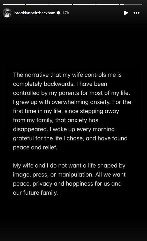 Këto deklarata vijnë pasi Brooklyn Beckham i ka akuzuar publikisht prindërit e tij, David dhe Victoria Beckham, se kanë tentuar të dëmtojnë martesën e tij me Nicola Peltz Beckham dhe se, sipas tij, kanë shpërndarë “gënjeshtra të panumërta” për ta, si në mënyrë private ashtu edhe përmes mediave.