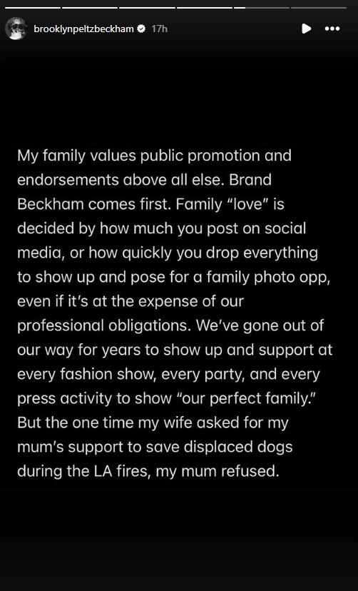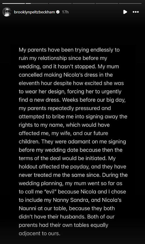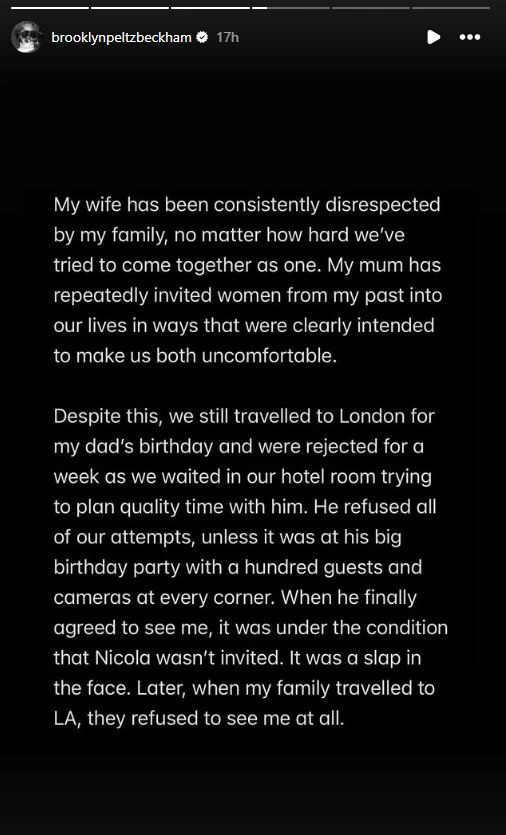 Brooklyn, i cili dëshiron të jetë shef i njohur kuzhine, ka shkruar një tekst të gjatë të cilin e ka publikuar në InstaStorys, ku ka thënë se familja e tij e ngushtë asnjëherë nuk e ka pranuar, gruan e tij, Nicolan.