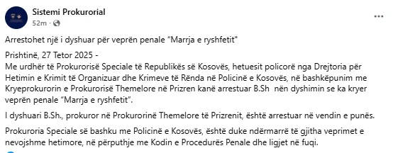 “Me urdhër të Prokurorisë Speciale të Republikës së Kosovës, hetuesit policorë nga Drejtoria për Hetimin e Krimit të Organizuar dhe Krimeve të Rënda në Policinë e Kosovës, në bashkëpunim me Kryeprokurorin e Prokurorisë Themelore në Prizren kanë arrestuar B.Sh nën dyshimin se ka kryer veprën penale ‘Marrja e ryshfetit’. I dyshuari B.Sh., prokuror në Prokurorinë Themelore të Prizrenit, është arrestuar në vendin e punës”, thuhet në njoftim.