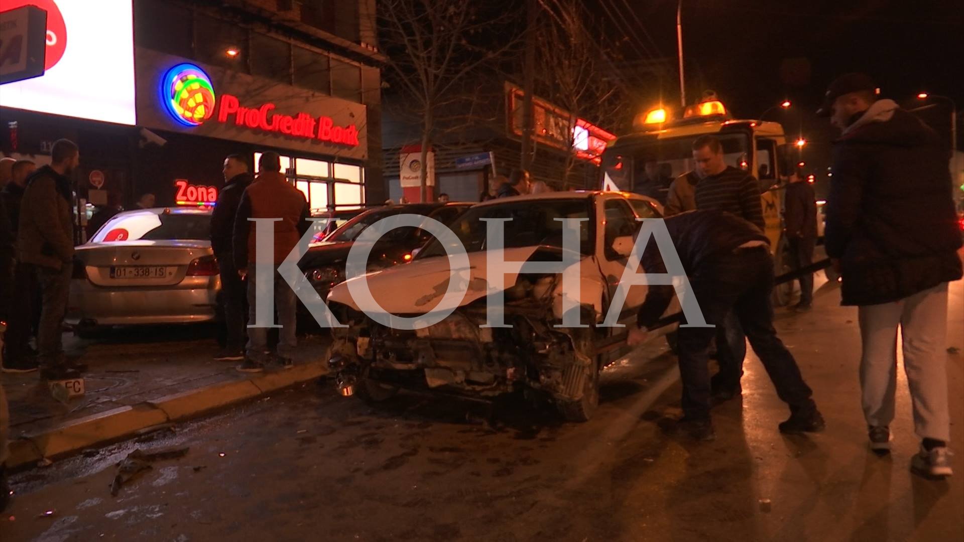 Nga përplasja njëra prej veturave ka përfunduar në lokalet e një banke në afërsi, së cilës i janë thyer xhamat.