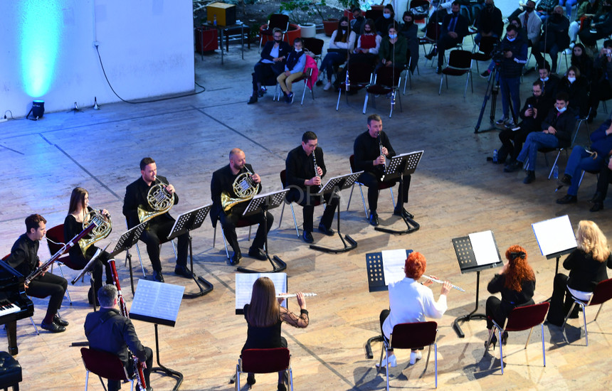 Anëtarët e ansamblit frymor janë shpërndarë përballë njëri-tjetrit për të bërë një kapërcim muzikor tek vepra shqiptare (Foto: Arben Llapashtica)