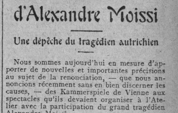 Ne jemi në gjendje tani të sjellim detaje të reja dhe të rëndësishme rreth heqjes dorë – të cilën e shpallëm kohët e fundit pa trajtuar shkaqet – të Kammerspiele-s së Vjenës në lidhje me shfaqjet që ajo do të organizonte në “Atelier” me pjesëmarrjen e aktorit të madh tragjik Aleksandër Moisiut.