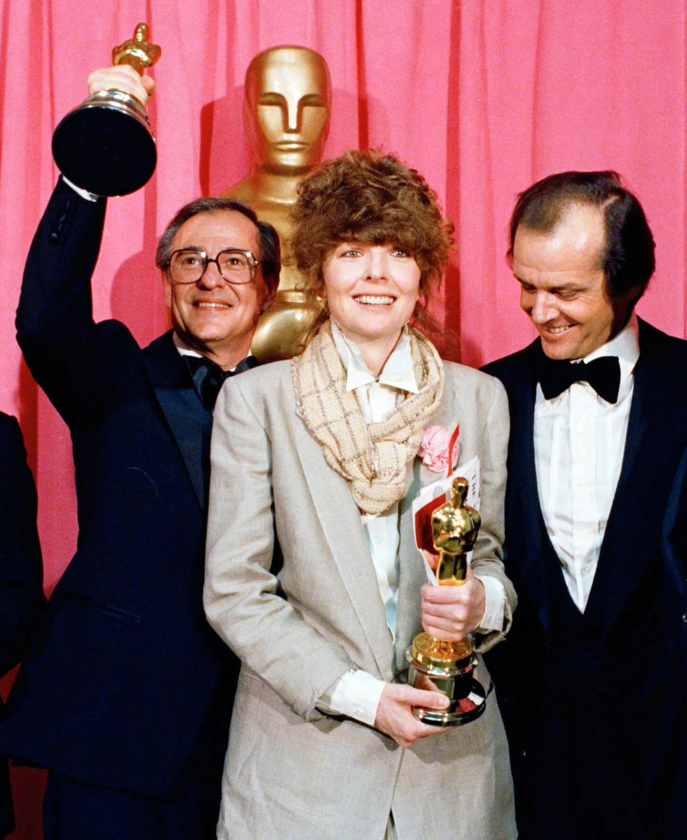 Diane Keaton në ndarjen e çmimeve “Oscar” në vitin 1978, ku ajo ishte fituese për filmin “Annie Hall”. Me të ishte, ndër të tjerë, Jack Nicholson, prezantues gjatë mbrëmjes, me të cilin ajo më vonë do të luante bashkë në ekran të madh (Foto: Associated Press)